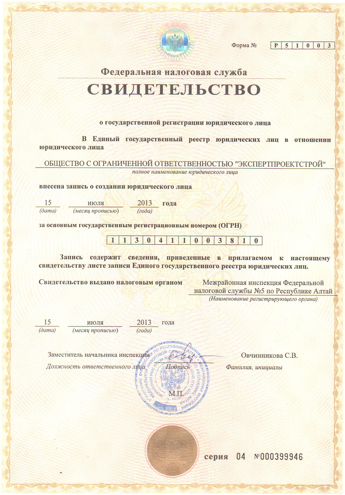 Свидетельство о регистрации юридического лица