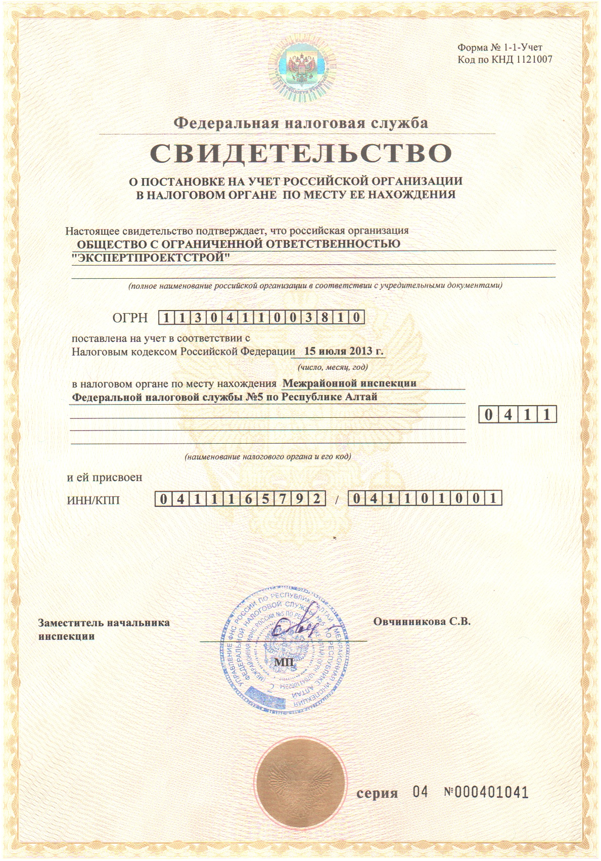 Свидетельство о постановке на учет в налоговом органе
